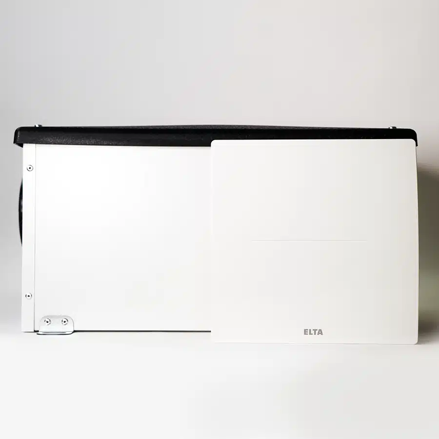 - Galvanised sheet steel casing, powder-coated in white (RAL 9010).